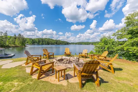 Emerald Bay is a luxury lake home named for its expansive bay views in clear year-round water. This custom home completed in Spring of 2022 is situated off the main channel in a protected bay. You will find breathtaking views throughout the home and outdoor entertaining at its finest. Enjoy swimming and water sports right off the stunning rock shoreline or from the 2-story double slip dock with rooftop entertainment space. The large fire pit provides entertainment after dark.